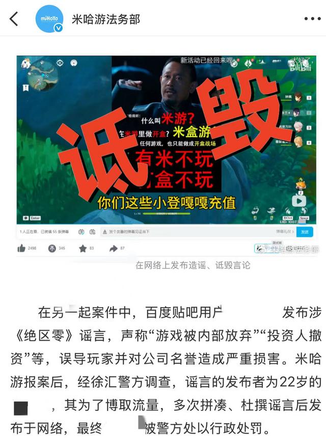 米哈游法务部称,此前,米哈游接到玩家举报称,一网络博主持续在多个网络平台发布不实信息,以视频、图文等方式对米哈游及旗下多款游戏实施造谣、诋毁行为,并侮辱、谩骂游戏玩家,严重破坏玩家社区环境,影响玩家游戏体验,同时严重损害公司声誉。米哈游报案后,徐汇警方调查发现,该账号实际持有人为黎某,警方认定黎某存在歪曲事实、散布谣言、扰乱社会秩序的违法行为,依法对其处以行政处罚。针对黎某的侵权行为,米哈游已提起民事诉讼,进一步追究其法律责任。