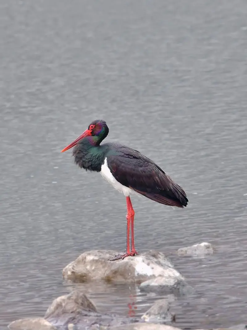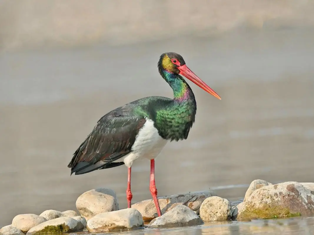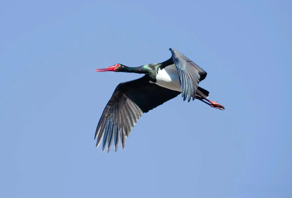 黑鹳的配色方案堪称自然界的经典设计:主体黑羽闪耀绿紫色金属光泽,胸腹纯白,搭配鲜艳的红喙和长腿。这种简约而不简单的配色让它们在各种环境中都格外醒目。