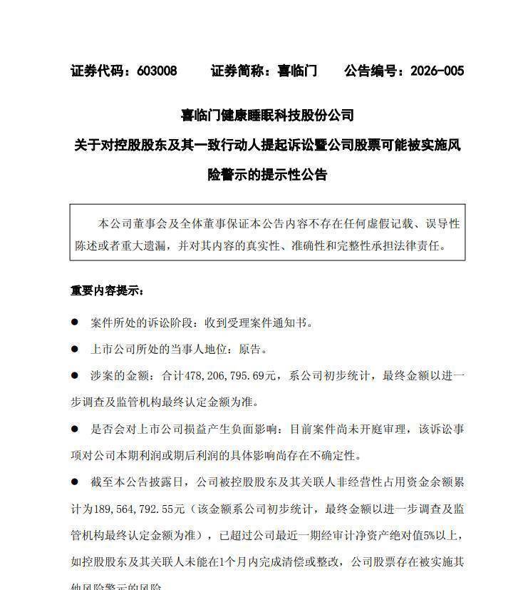 4月2日,喜临门再发《喜临门健康睡眠科技股份公司关于对控股股东及其一致行动人提起诉讼暨公司股票可能被实施风险警示的提示性公告公告》,起诉公司控股股东、索赔4.78亿元。