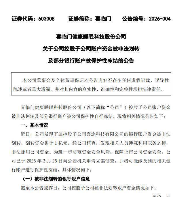 作为享誉全球的国潮床垫品牌,头顶“中国床垫第一股”的桂冠,喜临门的股价最近为何崩塌?分析指出,此次股价雪崩,源于公司近期密集披露的一系列触及监管红线的负面公告,暴露了其治理结构的深层缺陷。3月27日,喜临门公告称,其控股子公司喜途科技的银行账户1亿元资金被非法划转,公司已向公安机关报案。为防范风险,公司紧急对约9亿元银行账户进行保护性冻结,两项合计涉险资金超10亿元,占公司净资产的26.54%。