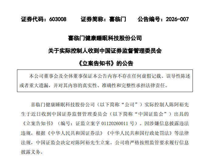 公告称,2026年3月31日,喜临门健康睡眠科技股份公司(以下简称“公司”或“本公司”)收到绍兴市越城区人民法院的《受理案件通知书》(2026)浙0602民初4695号。公司及下属全资子公司浙江顺喜供应链有限公司(以下简称“顺喜公司”)、浙江迎喜供应链管理有限公司(以下简称“迎喜公司”)(以下合称为“原告”)共同起诉公司控股股东浙江华易智能制造有限公司(以下简称“华易智能制造”)及其一致行动人绍兴市越城区华瀚股权投资合伙企业(有限合伙)(以下简称“华瀚投资”)、陈阿裕先生(以下合称“控股股东及其一致行动人”或“被告”)以损害公司利益责任纠纷为由要求其承担赔偿责任的相关案件已立案。